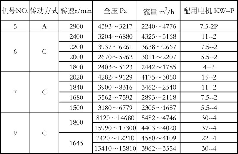 6-30型谷物、粉末輸送離心風(fēng)機性能參數(shù)表
