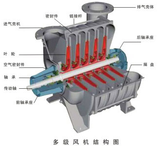 機(jī)殼材料采用HT250鑄件,經(jīng)過時(shí)效和熱加工處理,保證強(qiáng)度及材料分子結(jié)構(gòu)的穩(wěn)定性。機(jī)殼的主要部件由進(jìn)氣機(jī)殼、中間隔盤、排氣機(jī)殼組成,它們采用橡膠密封圈密封,并通過煤油滲漏試驗(yàn),保證氣體不泄露。葉輪出口處設(shè)有擴(kuò)壓器,進(jìn)口處設(shè)有回流器,保證鼓風(fēng)機(jī)效率。為適應(yīng)各種不同所需壓力和流量,鼓風(fēng)機(jī)級數(shù)可采用2級-10級壓縮。進(jìn)、出氣口位置根據(jù)用戶的需要,電機(jī)可以安裝在進(jìn)氣端;也可以安裝在排氣端;法蘭面既可垂直向上,也可水平向左。